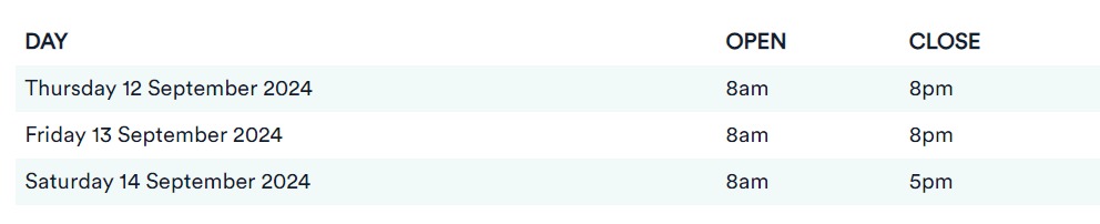 - 운영시간: 2024년 9월 12일(목) ~ 2024년 9월 14(토) 오전 8시 ~ 오후 8시