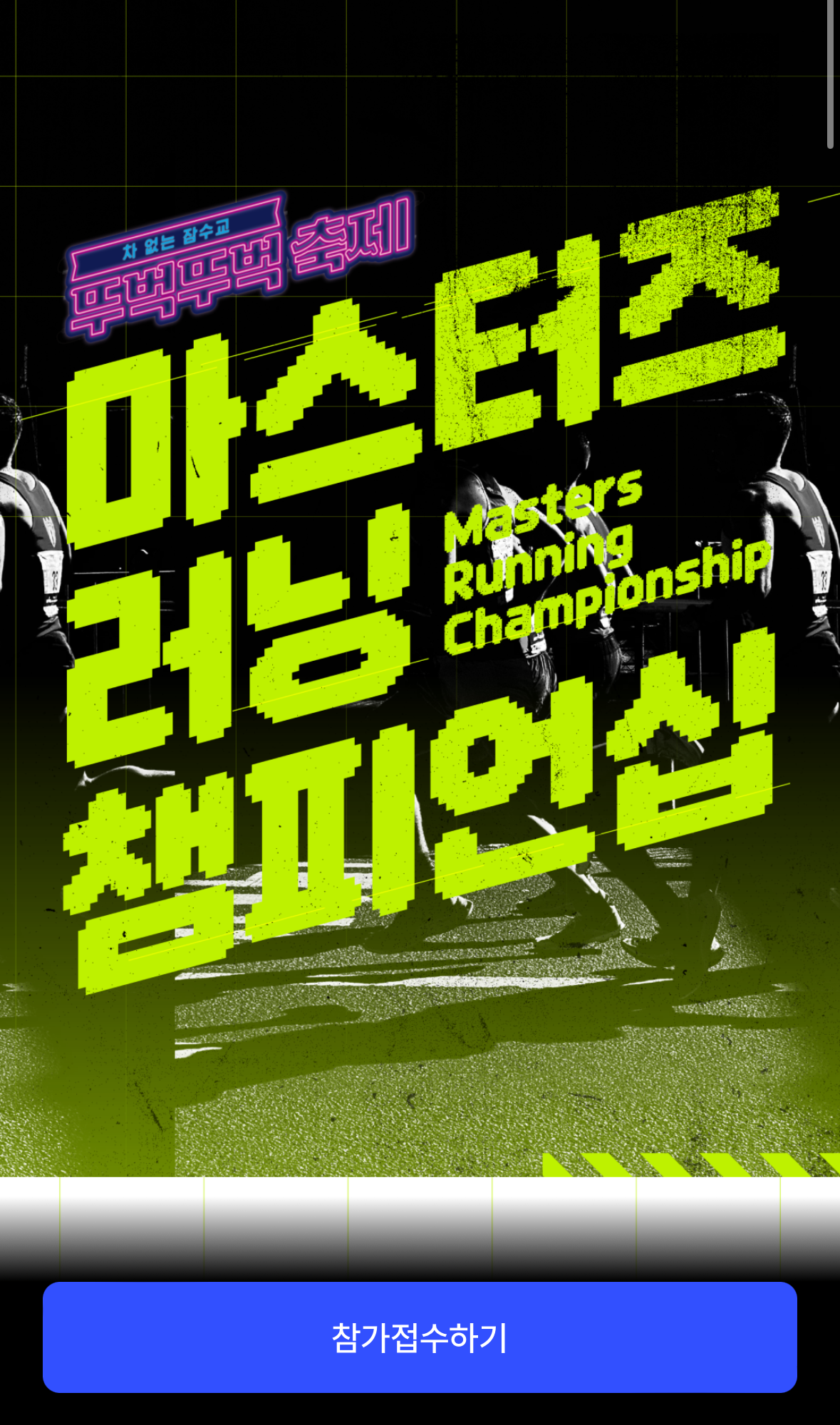 차 없는 잠수교 뚜벅뚜벅 축제와 함께 피날레를 장식할 마스터즈 러닝 챔피언십! 해당 대회에 참가하면 추후에도 <코리아 러닝리그> 등 참가 자격이 주어져 다양한 러닝 대회를 즐길 수 있을 거라 생각됩니다. 해당 챔피언십에 아쉽게 참가하지 못하더라도 본선이 있는 날 잠수교에서 중계석과 관람석이 따로 마련될 예정이라고 하니 방문하시어 눈으로 러닝을 즐겨보세요.