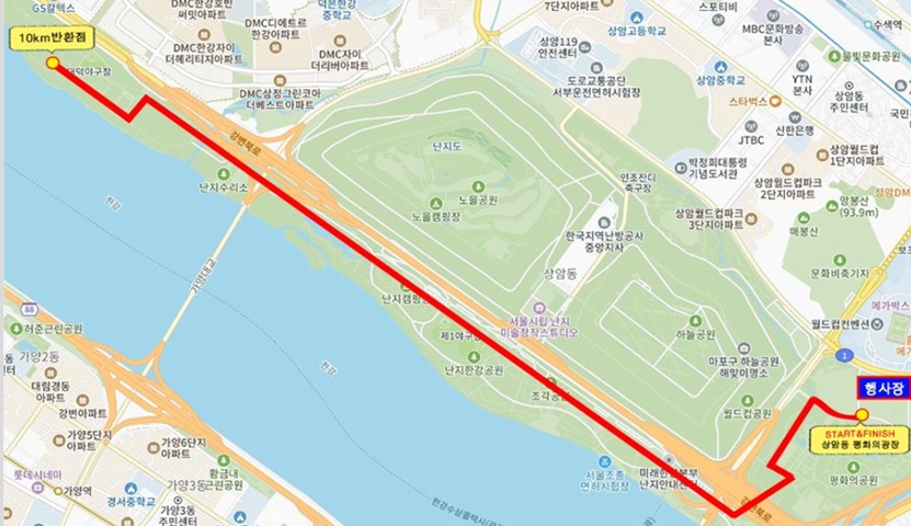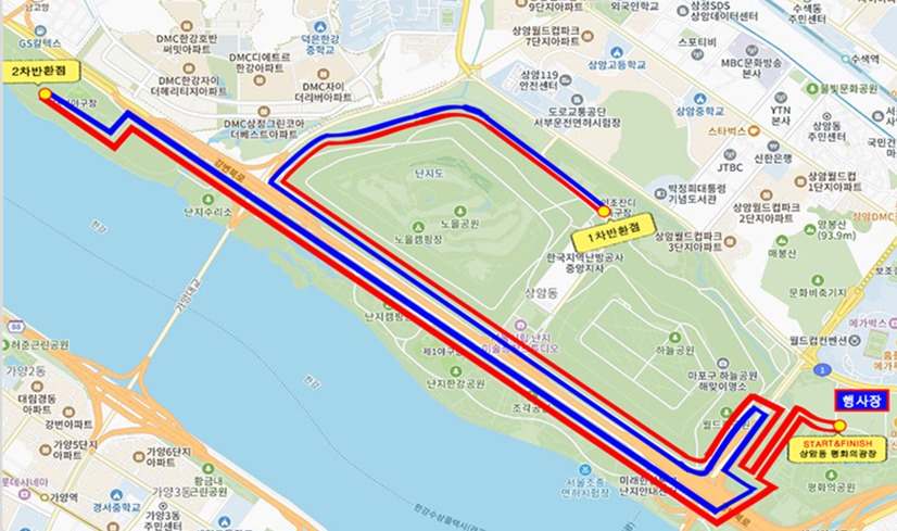 평화의광장 출발 ⇨ 평화 잔디광장 ⇨ 월드컵육교 ⇨ 인조잔디 축구장 1차반환 ⇨ 월드컵 육교 ⇨ 강변북로 구름다리 ⇨ 난지 자전거길 ⇨ 대덕야구장 2차반환 (유턴) ⇨ 평화의광장 도착