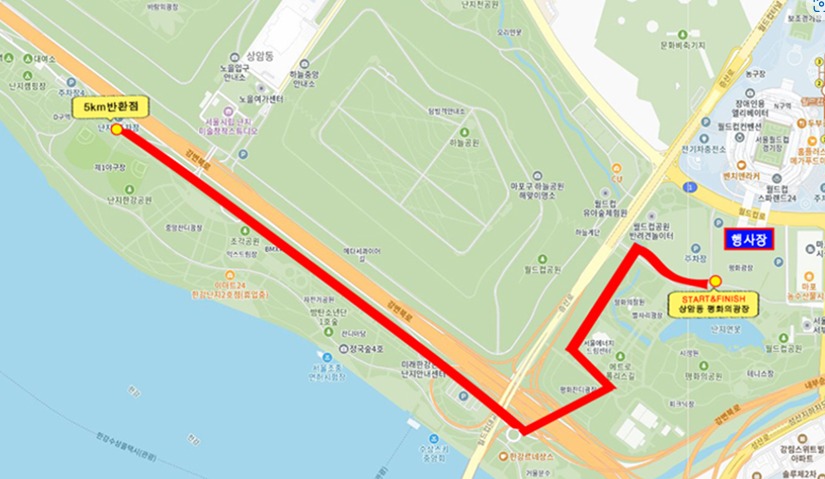 평화의광장 출발 ⇨ 평화 잔디광장 ⇨ 강변북로 구름다리 ⇨ 난지자전거길 ⇨ 제1야구장앞 반환 ⇨ 평화의광장 도착