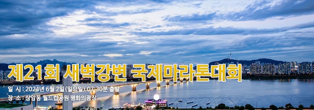 제21회 새벽강변 국제마라톤대회가 오는 6월 2일 일요일 상암동 월드컵공원 평화의광장에서 열립니다. 새벽강변이라는 키워드에 맞게 다소 시간이 이른 7시 30분 출발로 하는 대회인데요.