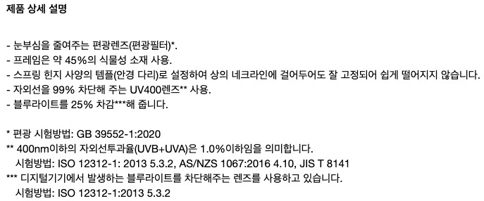 제품 상세설명에도 편광렌즈 스포츠 선글라스임을 알려주네요. 그 외에 자외선을 차단하는 렌즈를 사용하였다고 합니다. 그 덕에 눈 주변에 선크림을 꼼꼼히 바르지 않아서 좋아요. 선블럭 로션을 눈 주변에 바르게 되면 땀으로 인해 선블럭이 눈에 들어가서 따갑기 일쑤여서 눈 주변에 바르는 걸 선호하지 않았거든요. 스포츠 선글라스를 쓰고 러닝을 하게 되면 눈 두덩이를 비롯한 눈 주변에 선블럭을 사용하지 않아도 괜찮아서 좋더라구요.